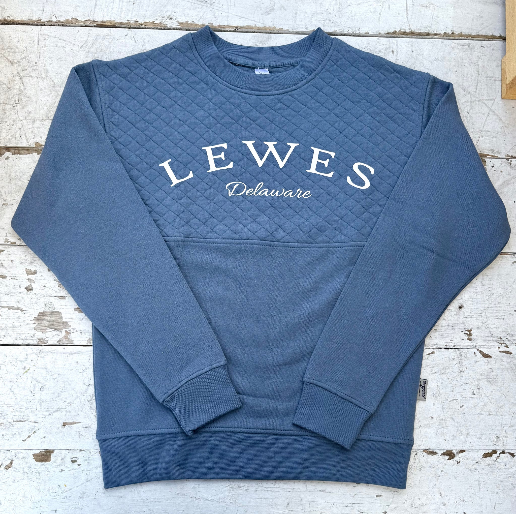 Discover the perfect blend of coastal charm and cozy comfort with our Lewes Delaware Quilted Crew Neck Sweatshirt. This distinctive pullover features a unique diamond-quilted upper panel that adds sophisticated texture, while the lower body and sleeves maintain a smooth, soft feel. Emblazoned with 'LEWES' in prominent white lettering and 'Delaware' in elegant script underneath, it's an ideal way to showcase your love for this beautiful coastal town.