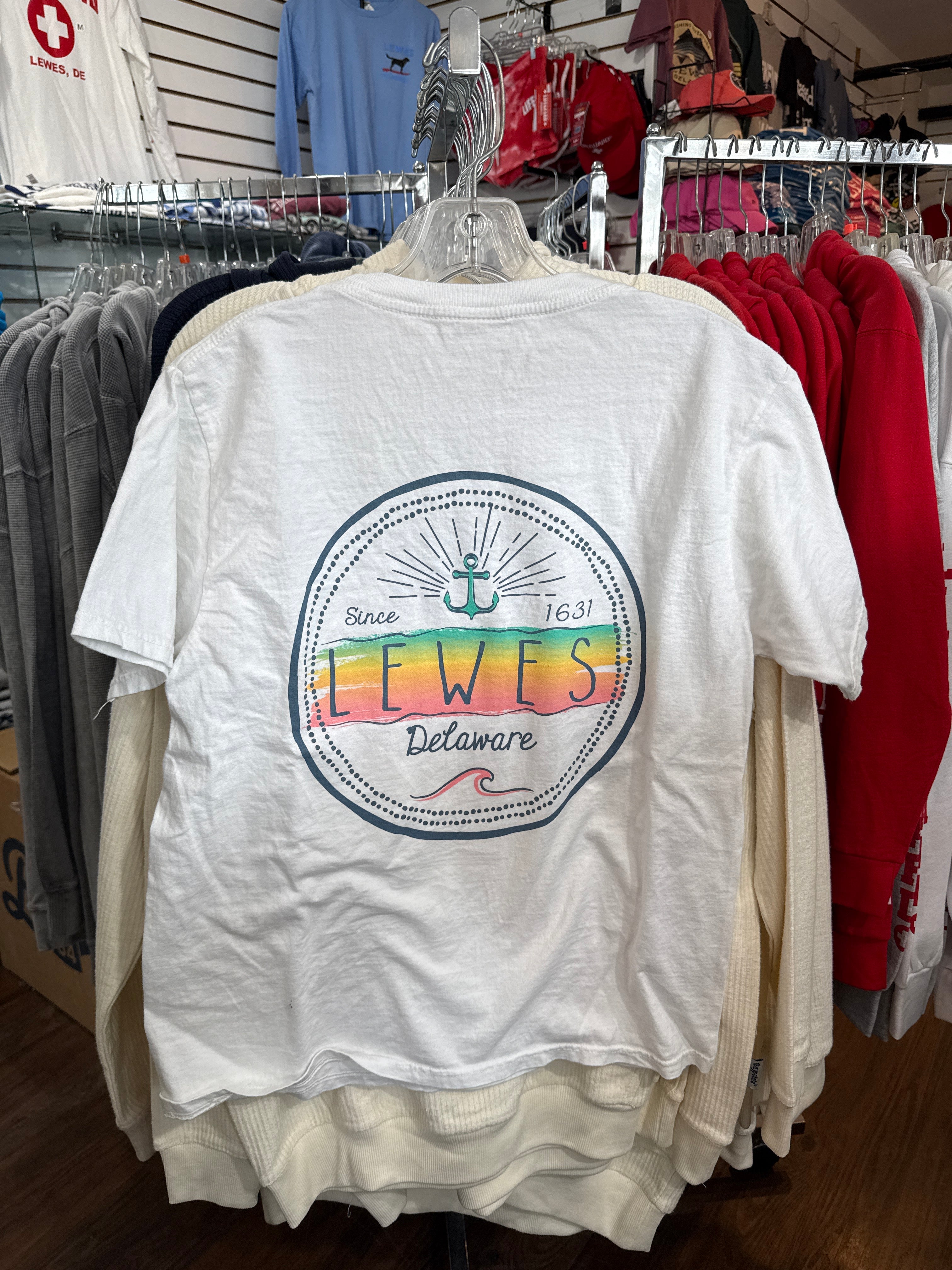 • Exclusive circular "Lewes Delaware Since 1631" graphic with anchor and pastel wave accents.